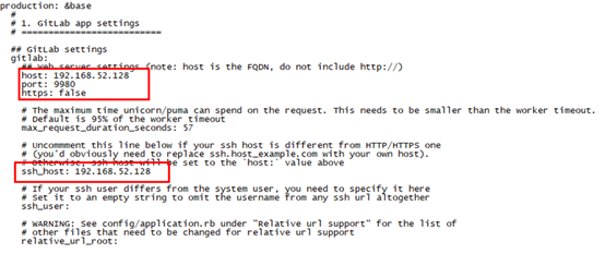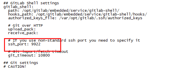 1 2 3 4 5 6 7 8 9 10 11 12 13 # 配置解释: # host:访问的IP 192.168.201.5 # port:访问的端口 9980 # 以上两个和gitlab.rb内external_url的配置保持一致 # ssh_host:ssh主机ip,和gitlab.rb内gitlab_rails['gitlab_ssh_host']保持一致 # 配置二:找到gitlab_shell标签下的ssh_port,将其修改为9922 #(和gitlab.rb内gitlab_rails['gitlab_shell_ssh_port'] 保持一致)