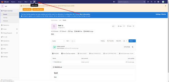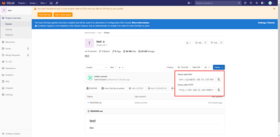 1 2 3 4 5 6 7 8 9 10 11 docker run \ -itd \ -p 9980:80 \ -p 9922:22 \ -v /usr/local/gitlab-test/etc:/etc/gitlab \ -v /usr/local/gitlab-test/log:/var/log/gitlab \ -v /usr/local/gitlab-test/opt:/var/opt/gitlab \ --restart always \ --privileged=true \ --name gitlab-test \ gitlab/gitlab-ce